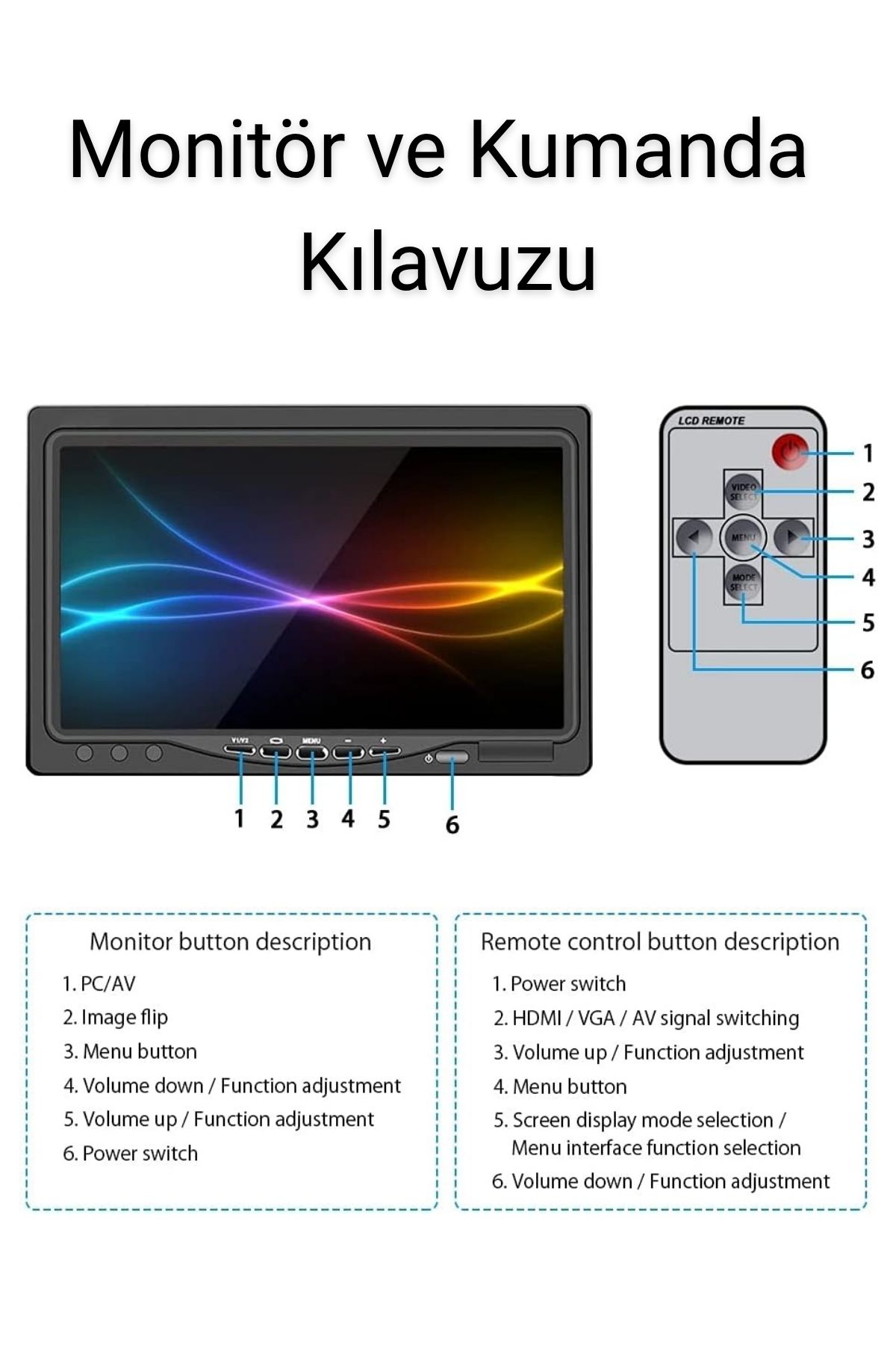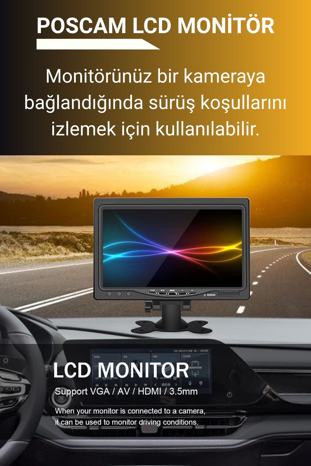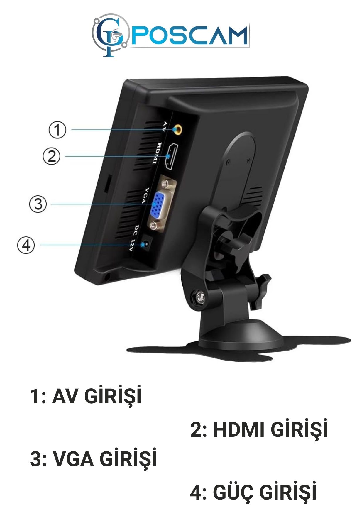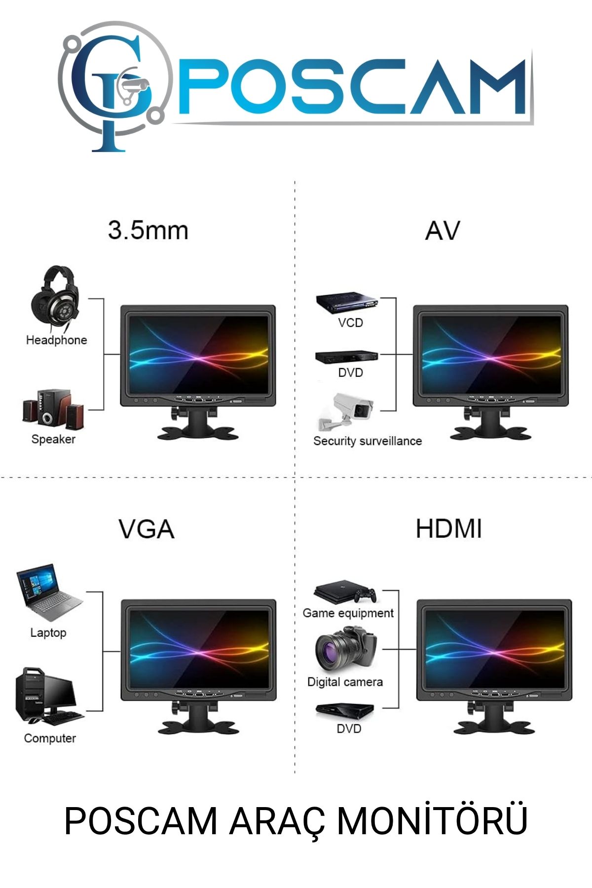 POSCAM AVSL710 7 İnç AV HD LCD Monitör, 800×480 HD çözünürlüğü ile net ve canlı görüntü sunar. AV giriş desteği sayesinde geri görüş kameraları ve güvenlik sistemleriyle kolayca entegre edilir. Kompakt tasarımı ve kumandalı kullanımı ile araç içi ve güvenlik uygulamaları için pratik ve ekonomik bir monitör çözümüdür.