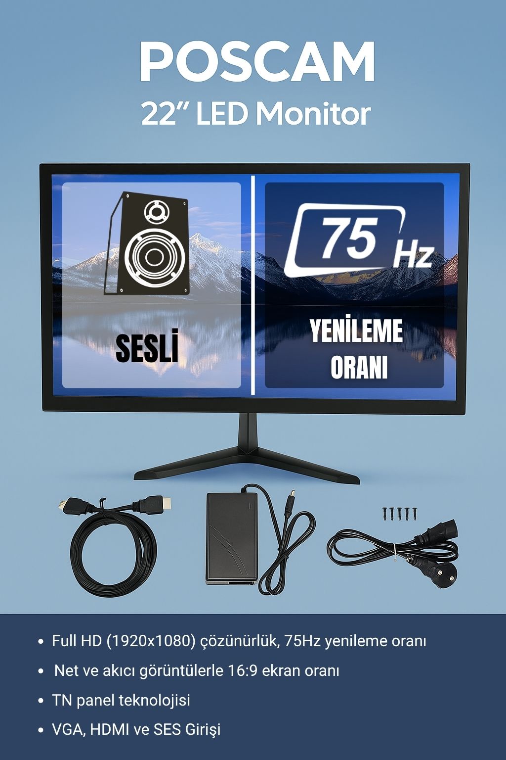 POSCAM GP22WH 22 İnç Full HD LED Monitör, 75Hz yenileme hızı ve 5 ms tepki süresi ile akıcı ve net görüntü performansı sunar. 16:9 görüntü oranı sayesinde geniş ve dengeli bir izleme deneyimi sağlar. HDMI, VGA ve AV girişleri ile çoklu bağlantı desteği sunan bu model, dahili ses özelliği ile hem ofis hem güvenlik sistemleri için ideal bir çözümdür.